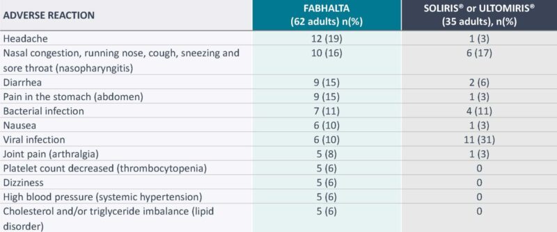 - Serious adverse reactions (kidney infection, urinary tract infection, and COVID-19) were reported in two people (3%) with PNH receiving FABHALTA1
